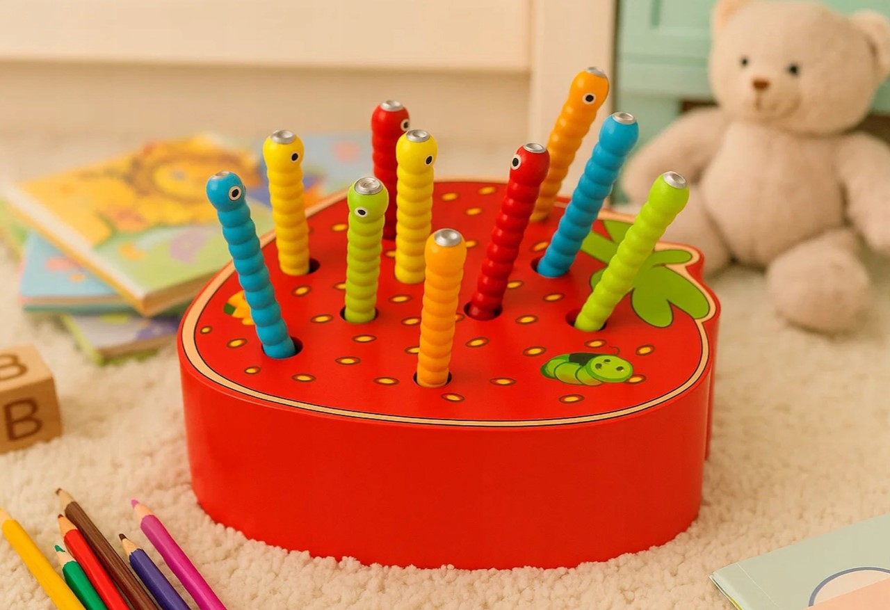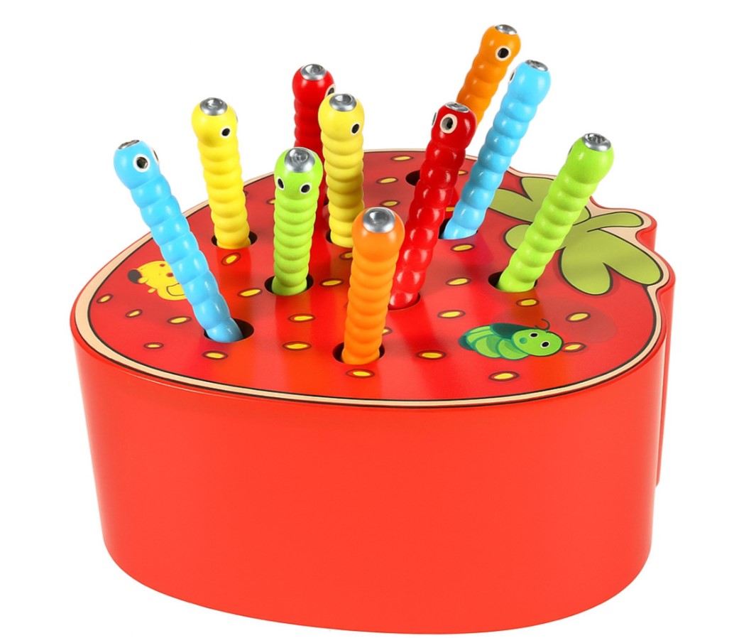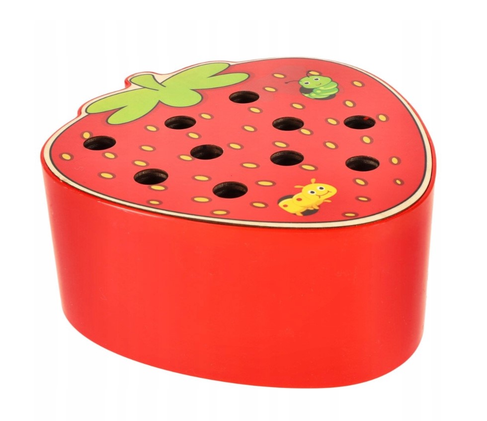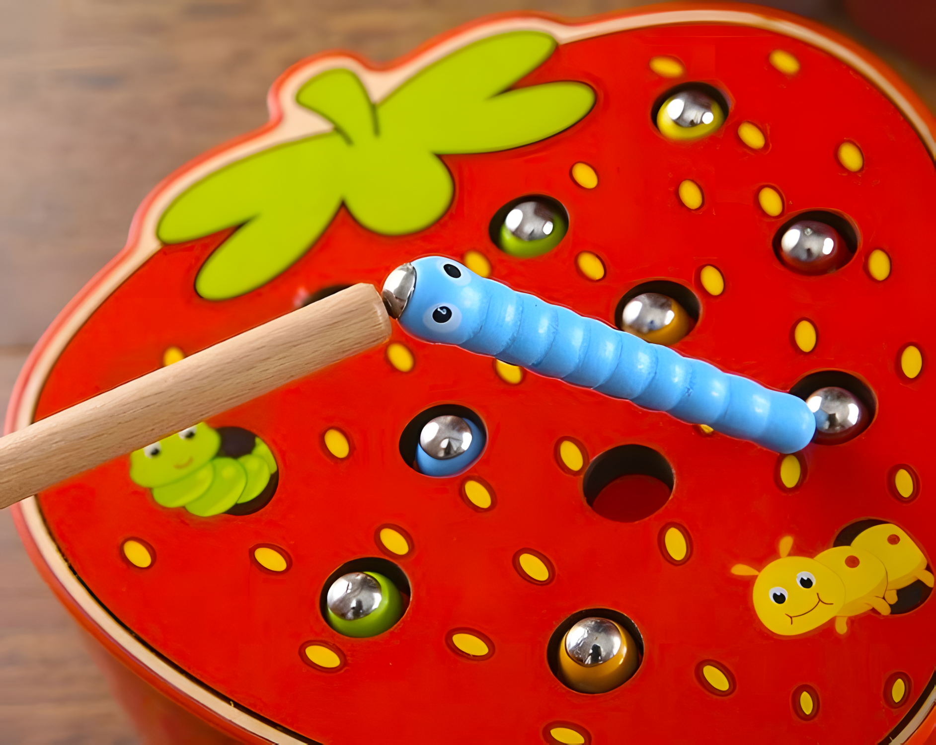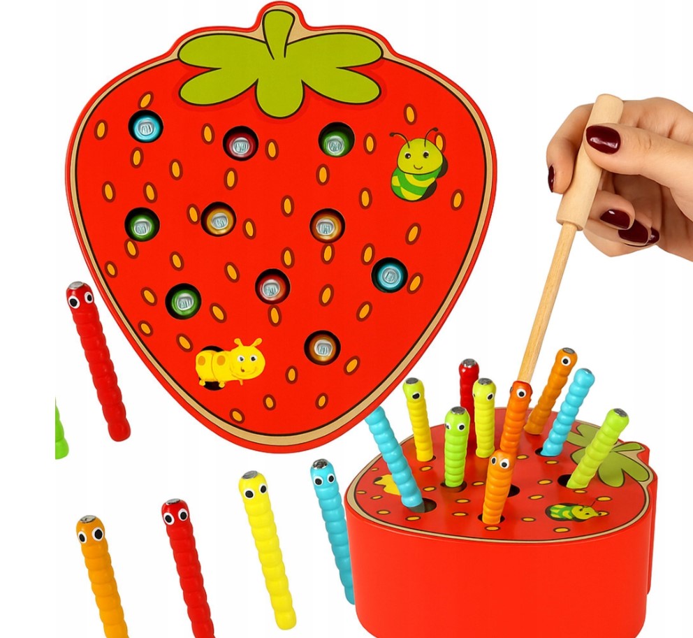 Laps saab magnetpulgaga “püüda” värvilisi ussikesi, mis peituvad maasika sees. See tegevus on nii kaasahaarav, et Puidust Mänguasi muutub kiiresti lapse lemmikuks.